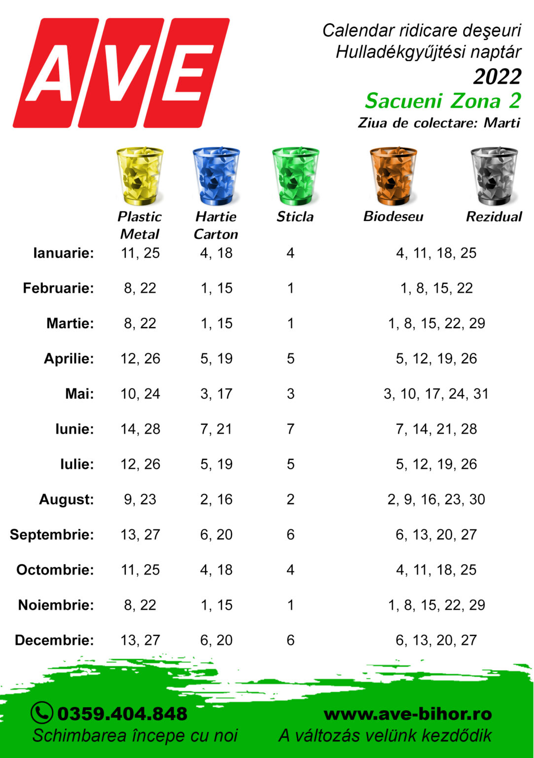 ZONA 2. – SĂCUENI- Coșul de gunoi gri (rezidual) și maro (bio) poate fi expuse afară în fiecare marți a lunii- În prima și a treia zi de marți, puteți expune și sacul albastru (hârtie)- Coșul de gunoi verde (sticlă) poate fi plasat în prima zi de marți – În a doua și a patra zi de marți, puteți expune sacul galben (plastic)De asemenea, în lunile în care va fi a cincea zi de marți (martie, mai, august, noiembrie) DOAR coșurile gri și maro vor fi golite!Vă rugăm să urmați programul și să expuneți coșurile și sacile dimineață la timp!În același timp, vă rugăm să vă asigurați că există doar deșeurile corespunzătoare în saci sau tomberoane!
