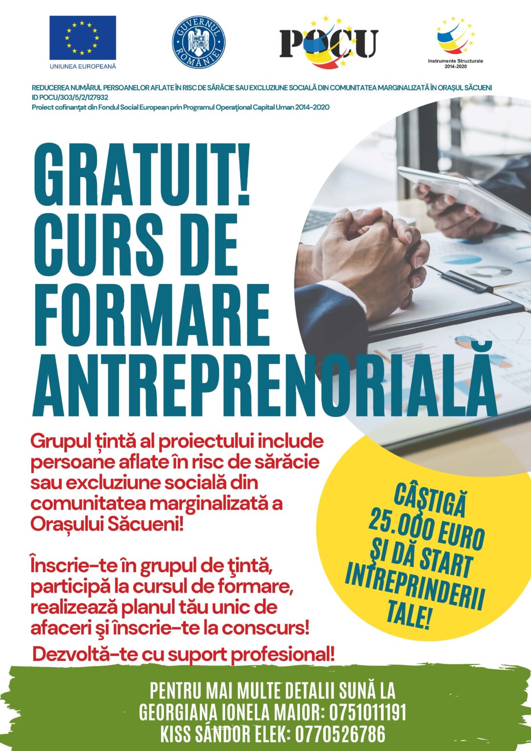Primul pas în vedere participării la activitatea de acordare de sprijin pentru înființarea de afaceri, persoanele interesate este  înscrierea în grupul țintă. Persoane de contact din partea Oraș Săcueni: